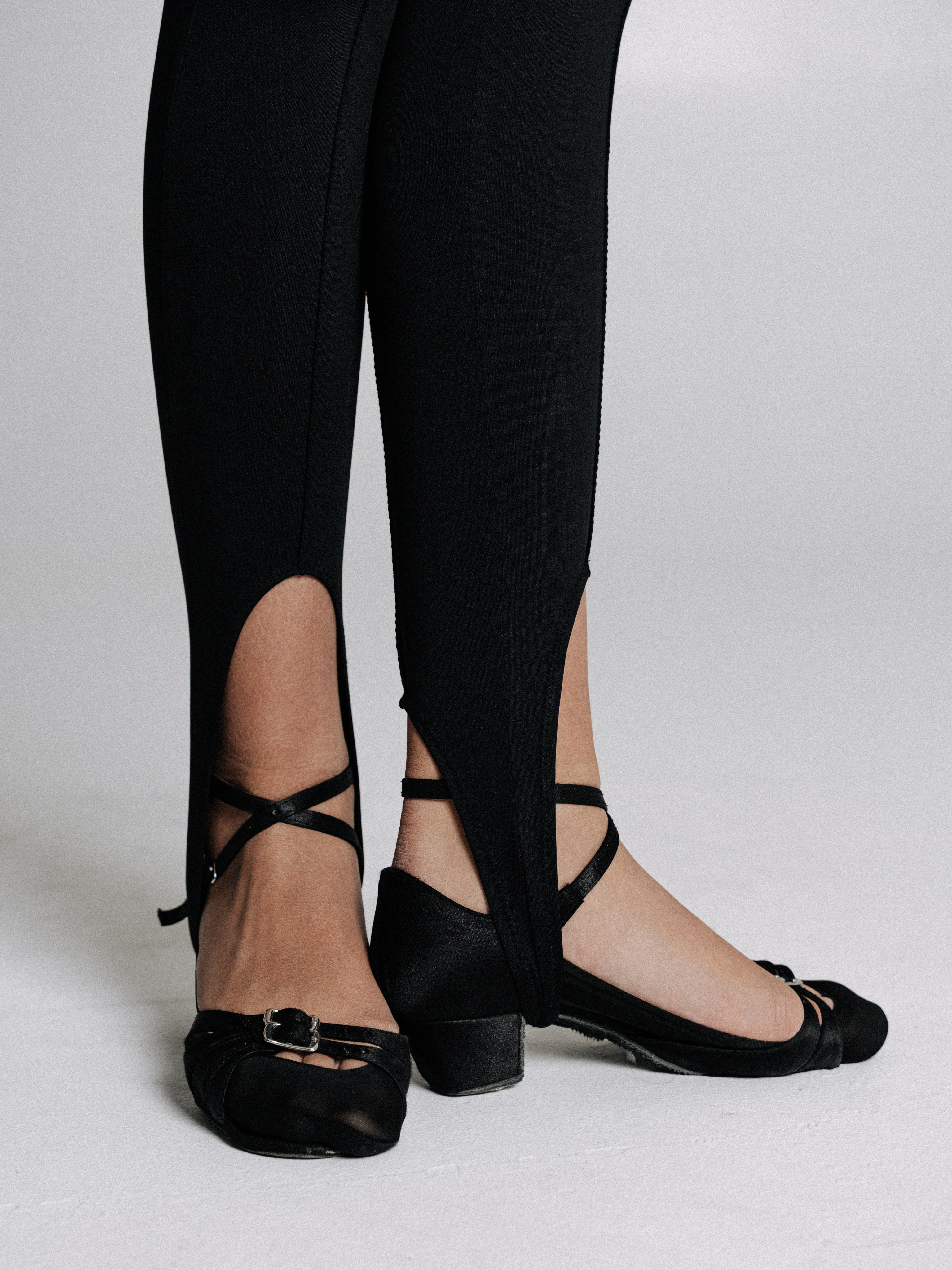 На фото Легинсы из трикотажной ткани спортекс, со штрипками. Посадка на талии. Пояс на резинке, со шлевками (без молнии). Застроченные стрелки на полочке и спинке брюк. Брюки для латиноамериканской программы бальных танцев, йоги, фитнеса, хореографии, прогулок.