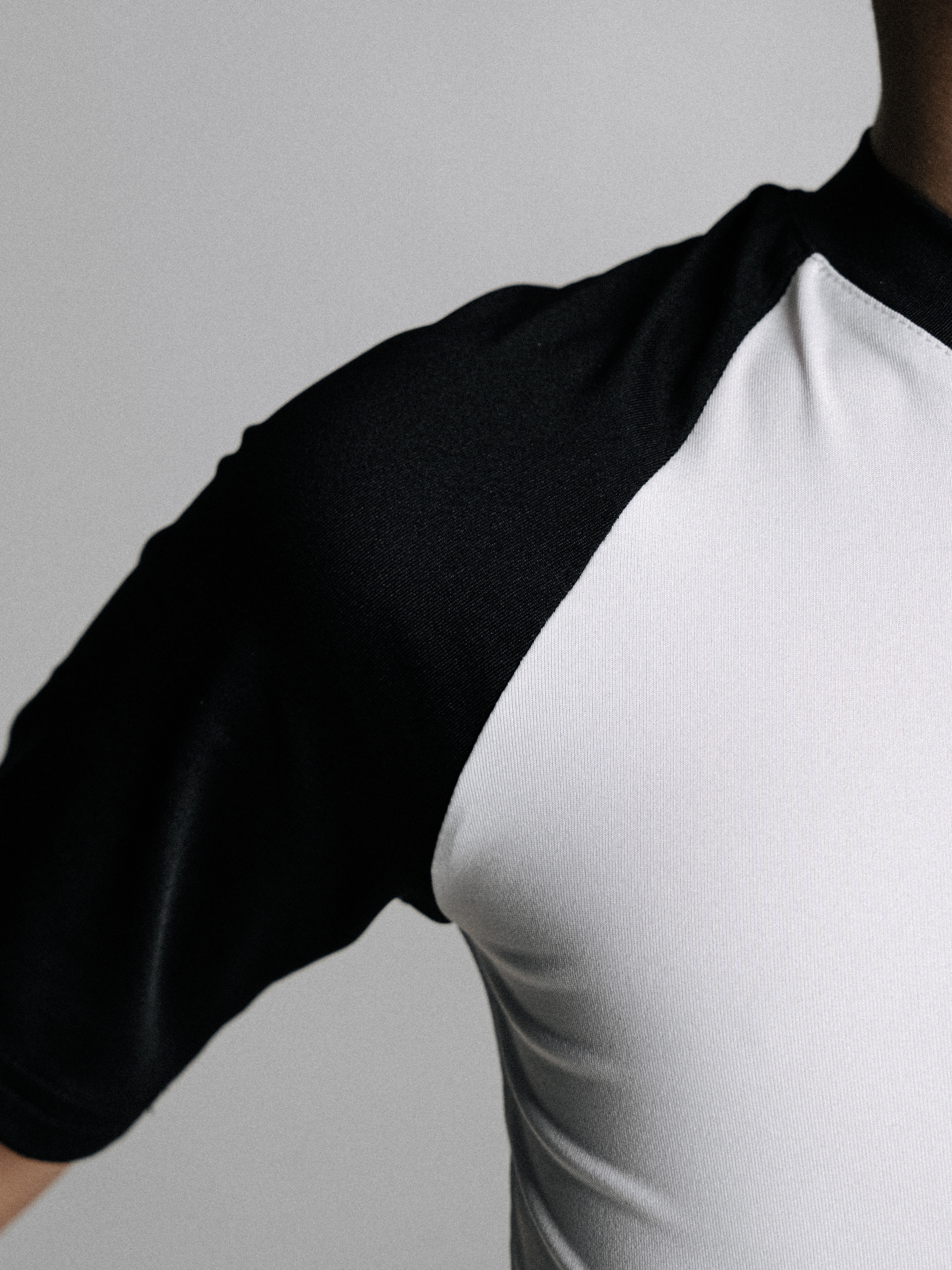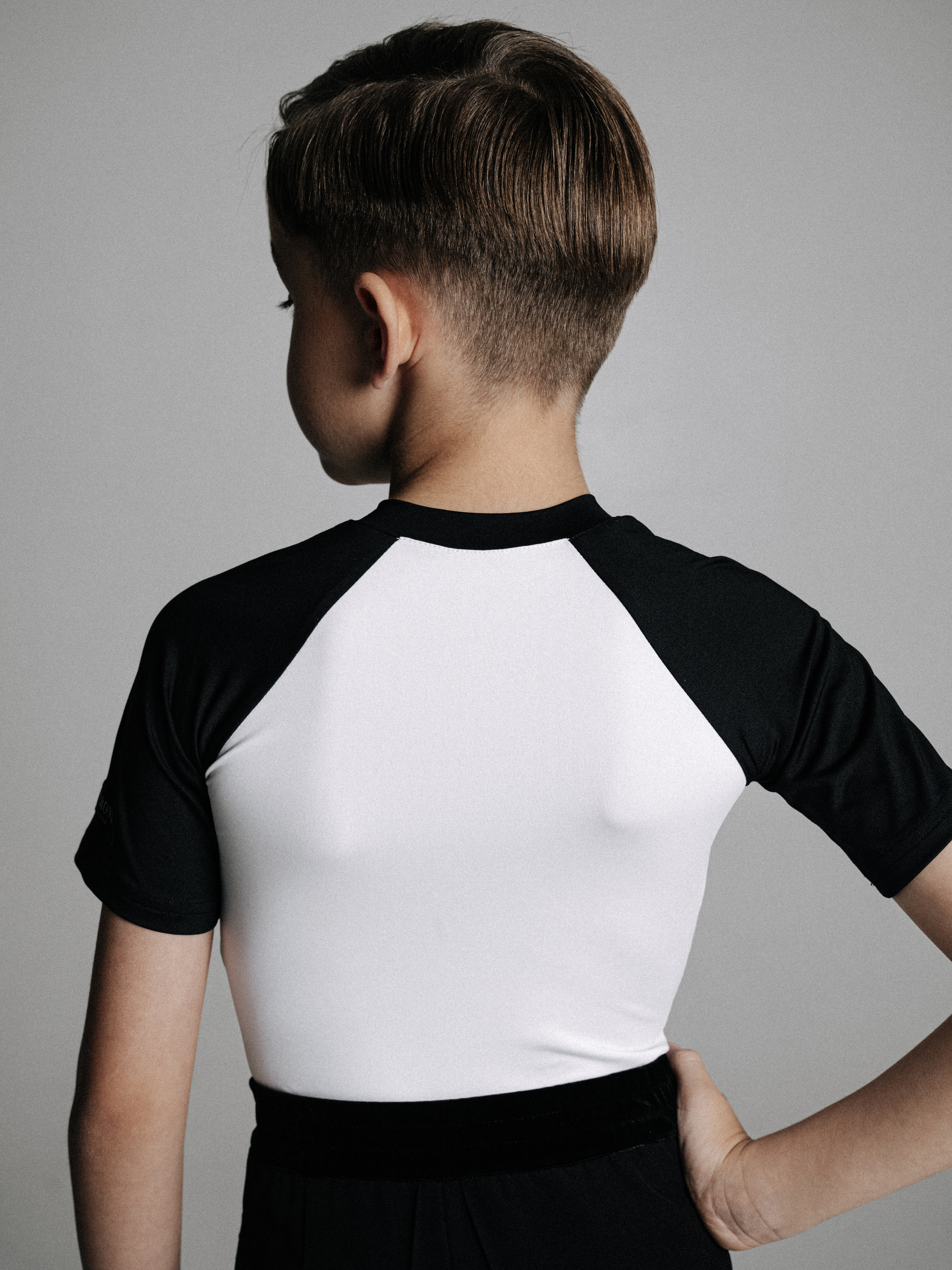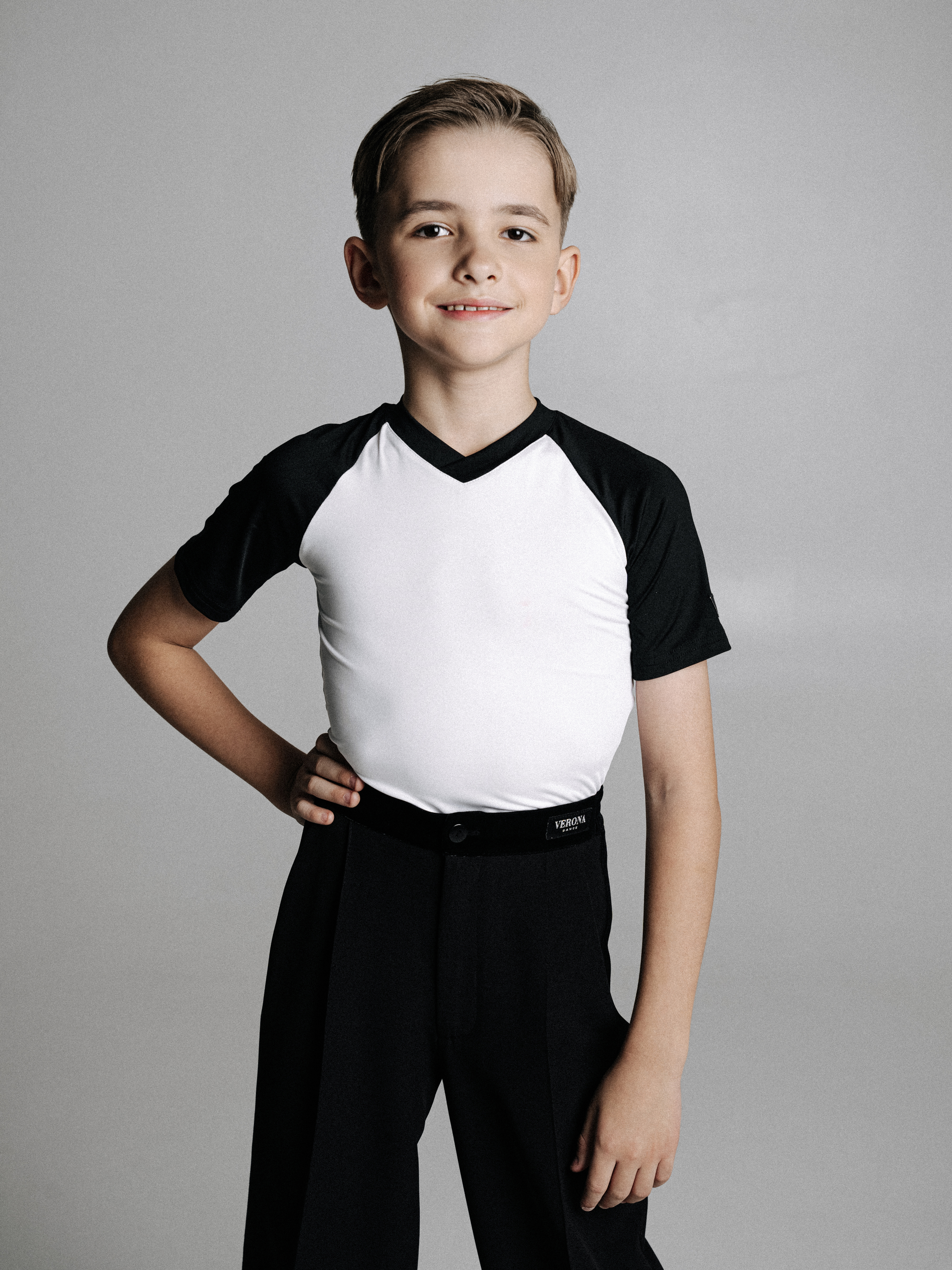 Мужская тренировочная футболка для бальных танцев. Выполнена из эластичного и приятного к телу материала. Вырез маленький угол,рукава реглан из перламутрового бифлекса.