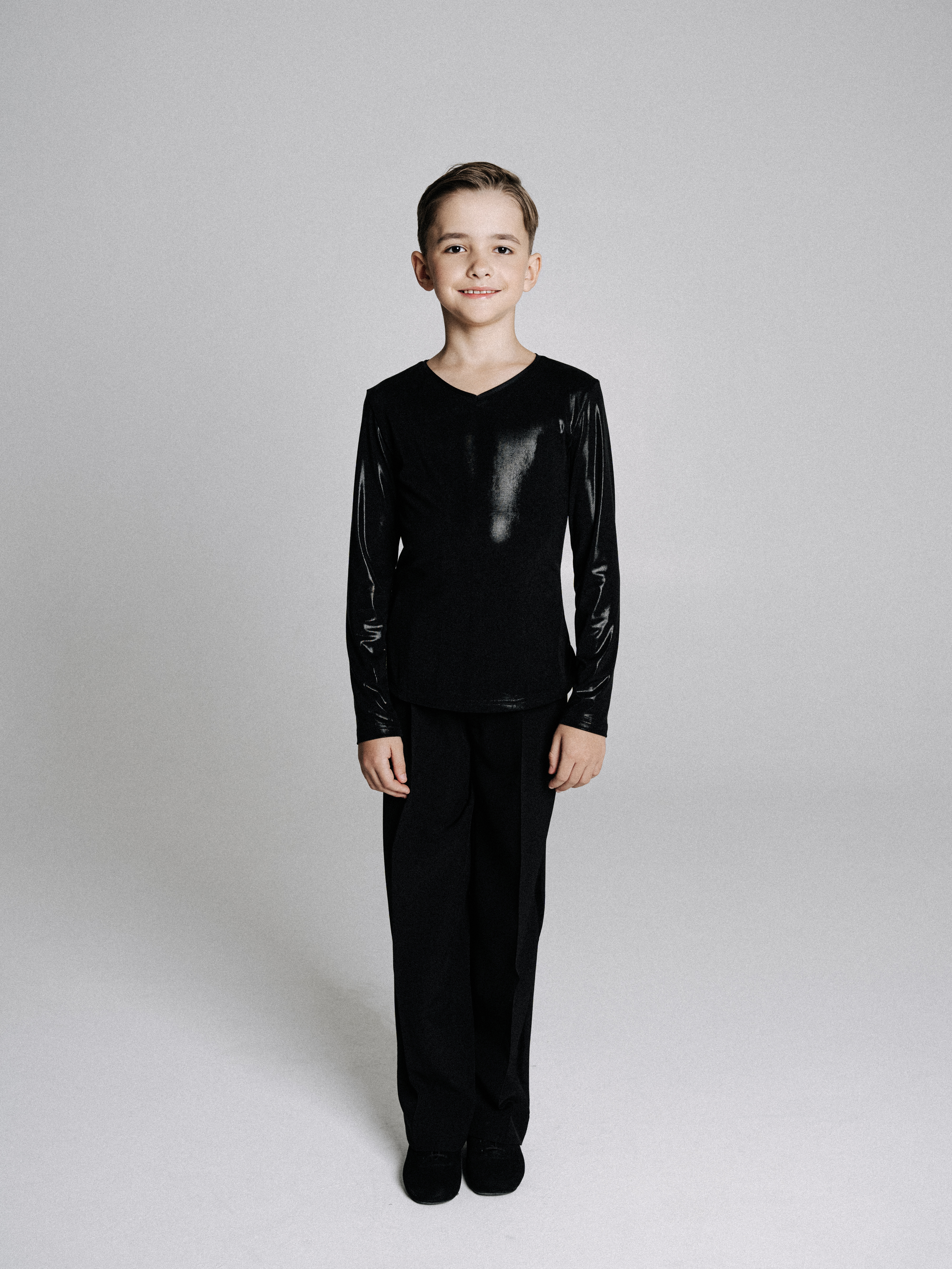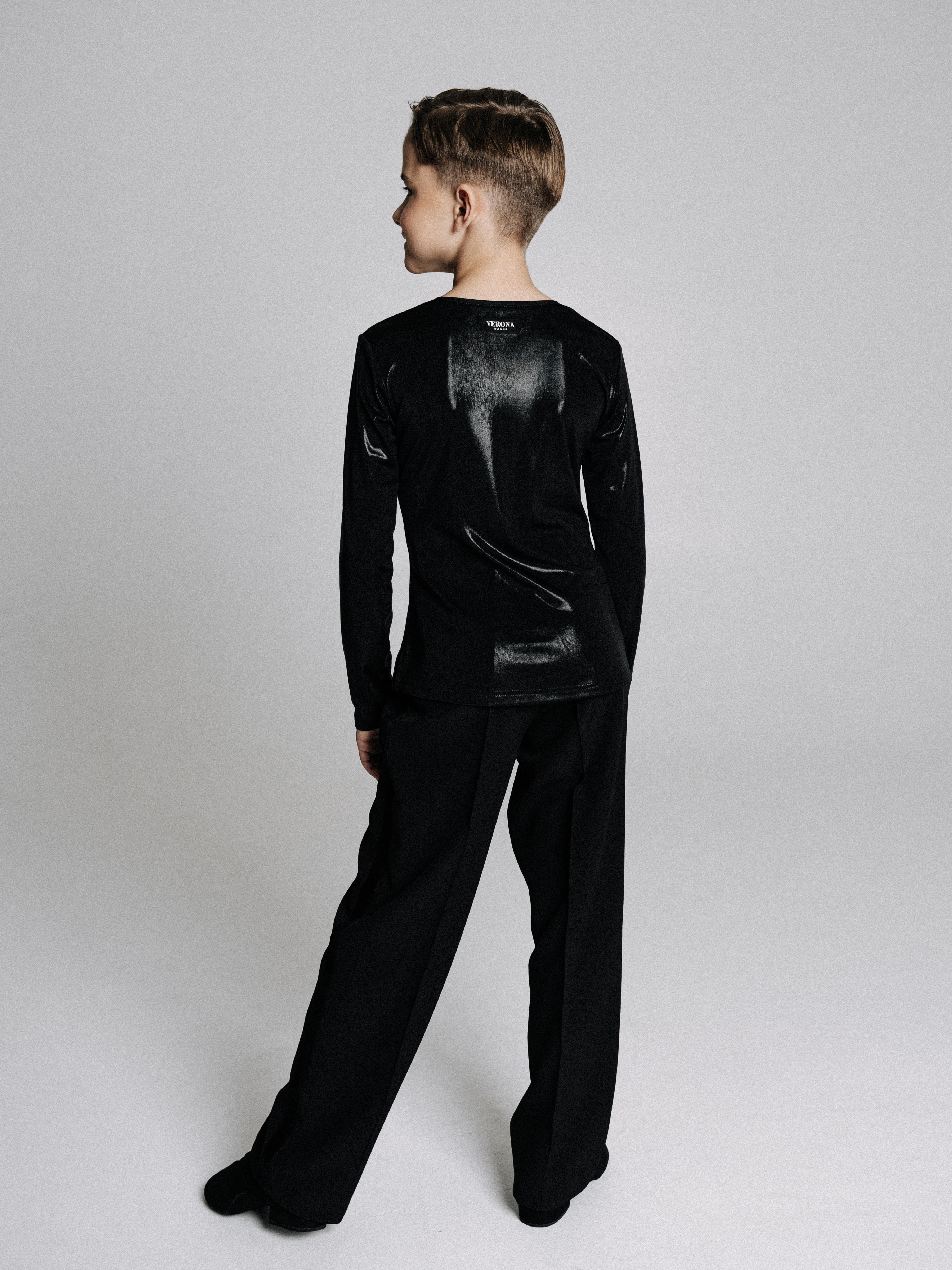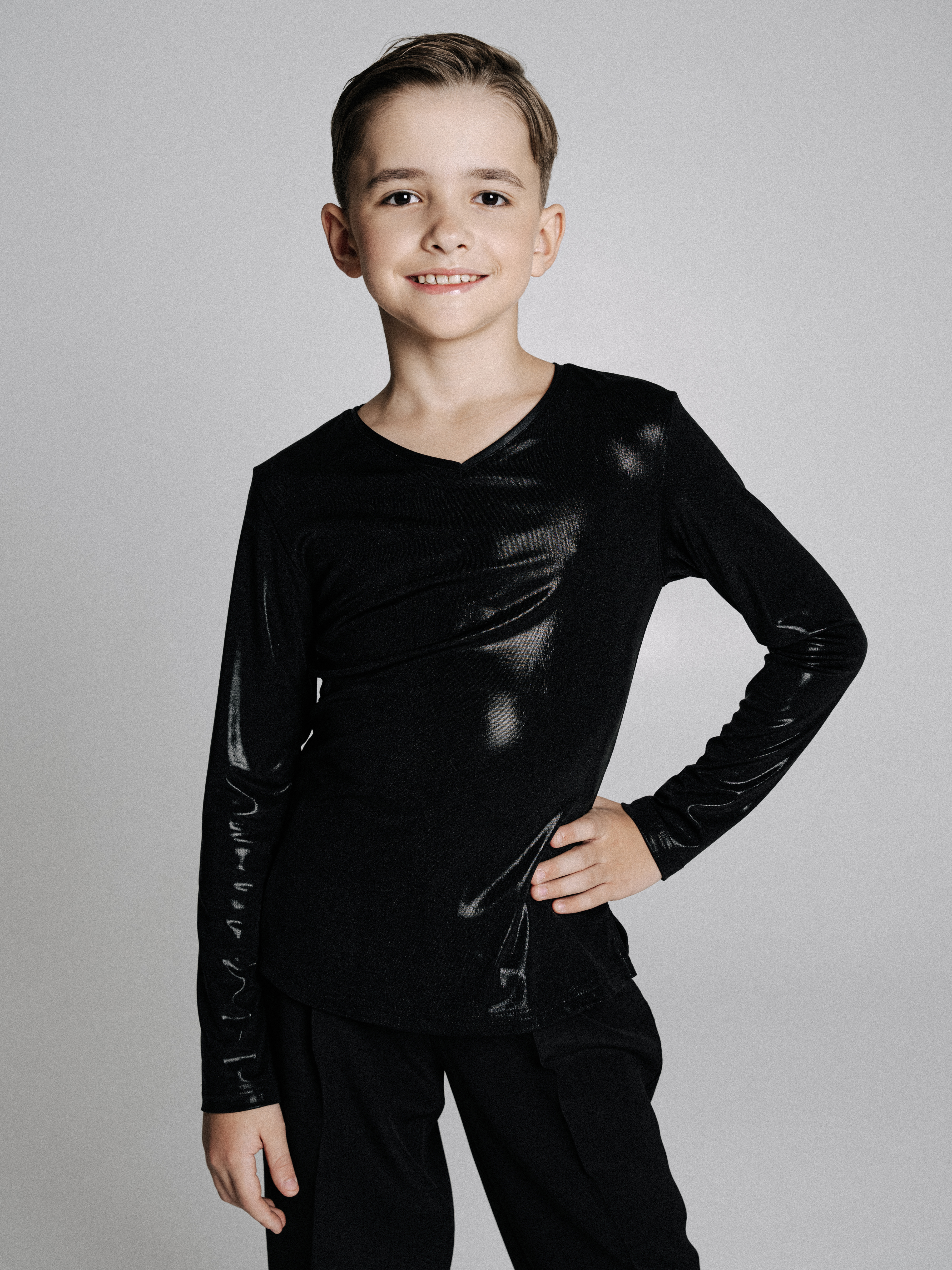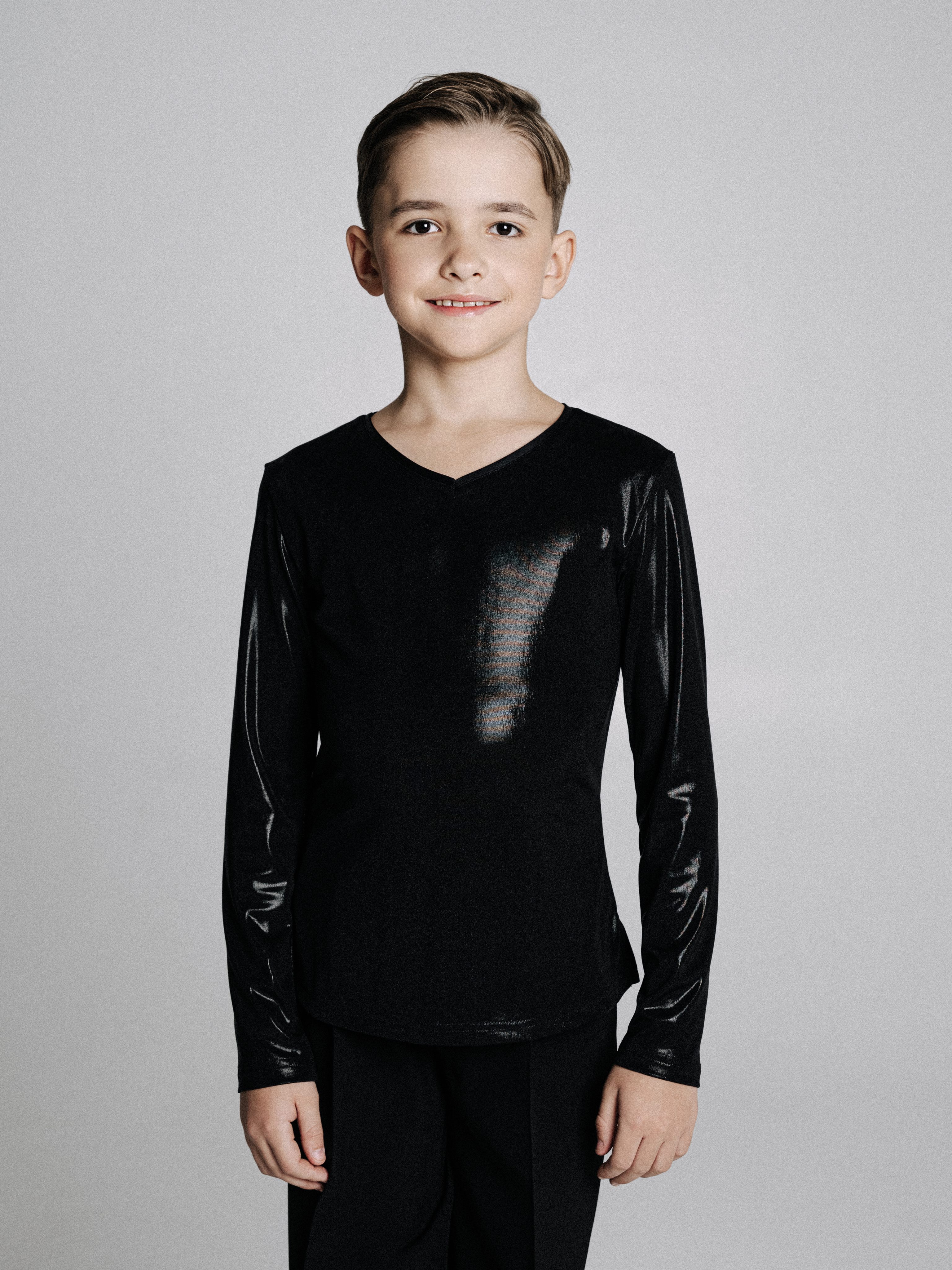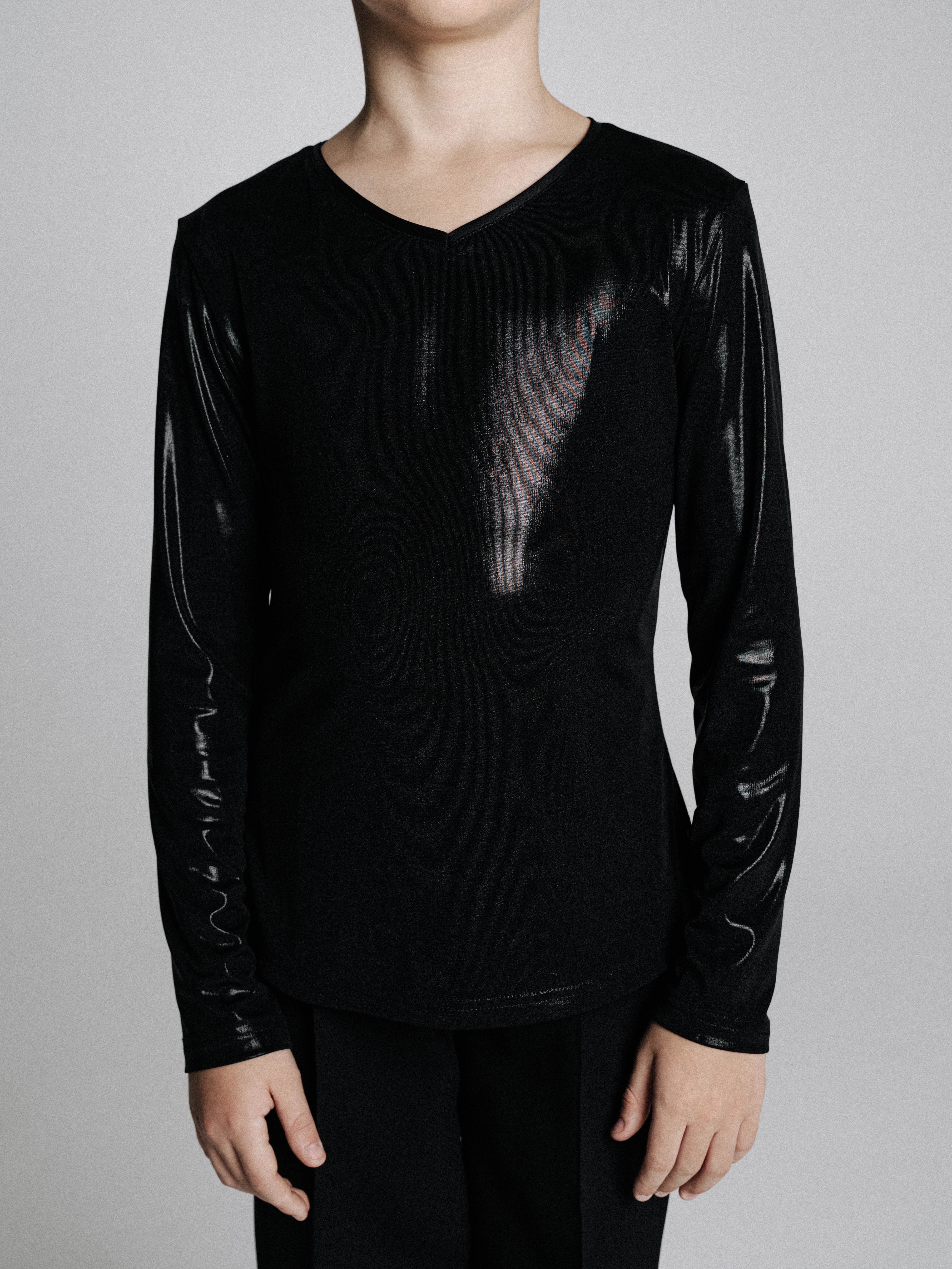 Рубашка из трикотажа с блеском — стиль и комфорт в каждом движении. Длинные рукава, боковые разрезы и акцентная планка из перламутра создают элегантный образ. V-образный вырез.